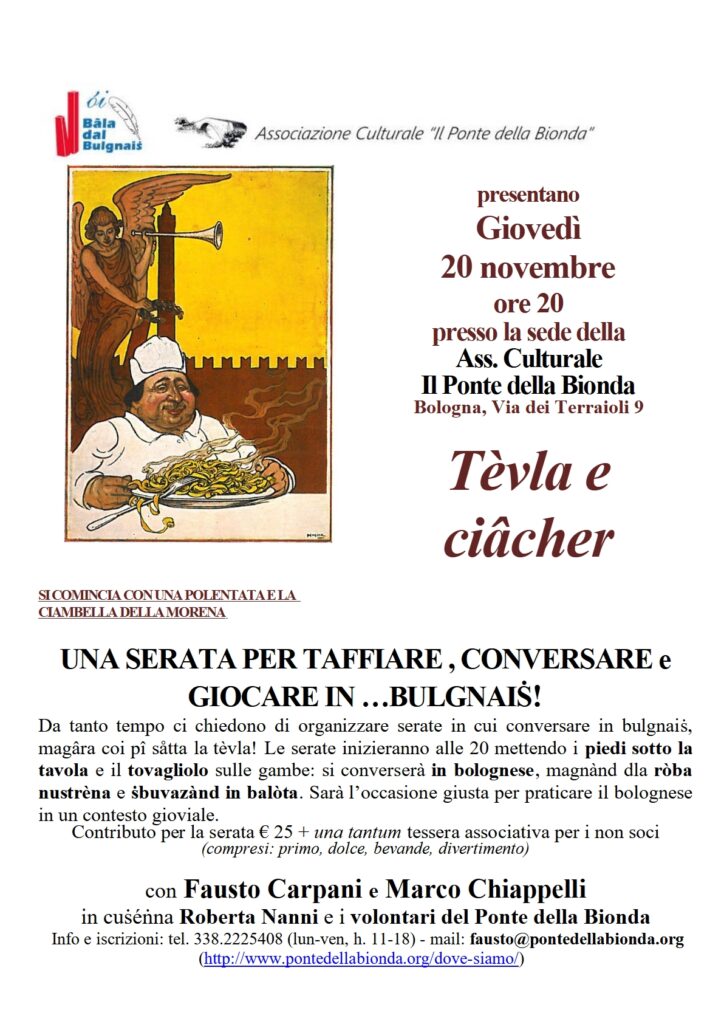 E’ l’occasione giusta per esercitarsi e praticare il bolognese in un contesto gioviale e amichevole: conversiamo, scherziamo e giochiamo insieme.